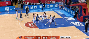 比赛最后45秒钟,青岛男篮100-104落后,这时候是广东男篮的球权,两队犯规都已经4次满额,犯规就要罚球。