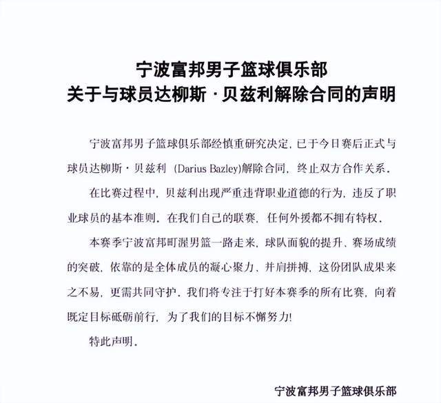 赛后不到一小时,宁波富邦男篮俱乐部火速发布官方声明:“经慎重研究决定,正式与球员达里厄斯·贝兹利解除合同。在比赛过程中,贝兹利出现严重违背职业道德的行为,违反了职业球员的基本准则。在我们自己的联赛,任何外援都不拥有特权。”措辞之严厉、反应之迅速,在CBA历史上极为罕见。