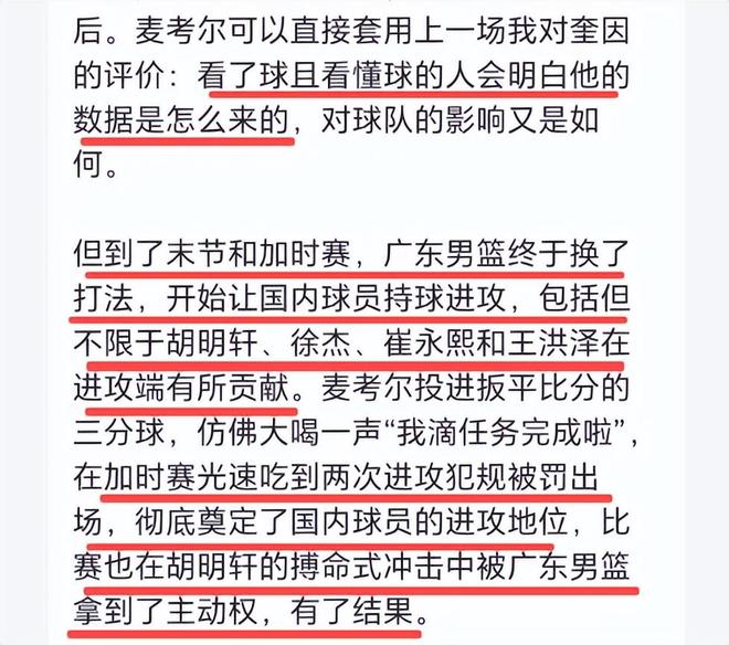 末节是依靠国内球员赢得了比赛。麦穗丰说,“但到了末节和加时赛,广东男篮终于换了打法,开始让国内球员持球进攻,包括但不限于胡明轩、徐杰、崔永熙和王洪泽在进攻端有所贡献”,麦穗丰指出:麦考尔在加时赛光速吃到两次进攻犯规被罚出场,彻底奠定了国内球员的进攻地位,比赛也在胡明轩的搏命式冲击中被广东男篮拿到了主动权,有了结果。