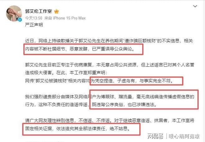 紧接着,郭艾伦工作室发布了一则措辞更为严正的声明。