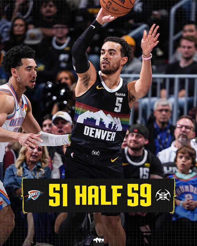 次节比赛,双方进攻火力均是下滑,且第二节均是单节不超过25分。掘金逐步扩大41-29领先,雷霆多点开花反扑追到仅差4分,罗迪被多尔特肘击导致鼻子流血下场治疗。掘金连得4分,雷霆连追4分,掘金再得5分扩大9分优势,雷霆继续反扑追分。掘金单节25-24再赢1分,上半场结束掘金59-51领先雷霆。