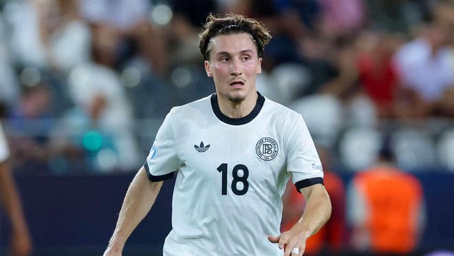 赖茨在一众德国国脚中奔跑,其中包括他未来在莱比锡的队友劳姆与亨里希斯。这张照片摄于2024年德国队欧洲杯备战期间,赖茨与未来的队友劳姆、亨里希斯同框。