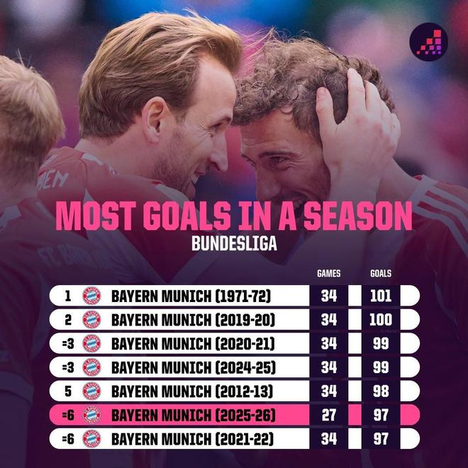 拜仁在今天战胜柏林联合的比赛中又打进4球,这意味着他们本赛季在德甲已经打进97球。在最后7场比赛中,他们只需要再打进5球,就可以打破自己在1971-72赛季创造的德甲纪录(101球)。