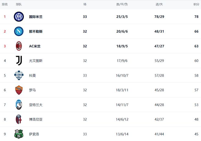 在积分榜上,国际米兰25胜3平5负,拿到78分,高居榜首位置。那不勒斯以66分排名第2。国际米兰足足领先那不勒斯12分。这样的差距让冠军归属几乎失去悬念。AC米兰就落后国际米兰更多了,只拿到63分,排名第3。第4名的是尤文图斯,拿到60分。输球的科莫依然是58分,排名第5。罗马以57分排名第6,比科莫少赛一场。亚特兰大拿到53分,排名第7。拉齐奥只有44分,排名第10。