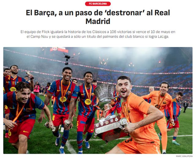 《阿斯报》指出,5月10日的西甲国家德比,将有重要意义。从国家德比胜场数来看,皇马106胜,巴萨105胜,还有52次打平。如果巴萨击败皇马,两队在国家德比的胜场数将打成106-106!