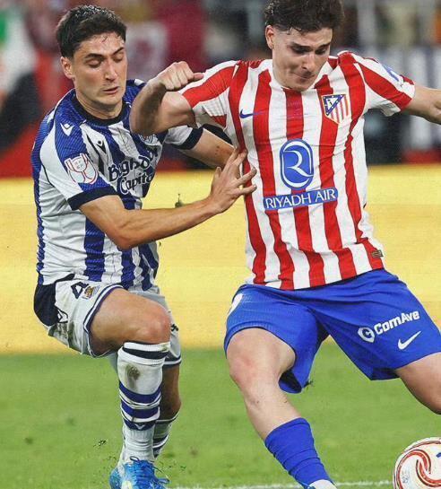 决赛第82分钟,当球队1比2再度落后,阿尔瓦雷斯挺身而出,接队友精妙传球后低射破门,将马竞从悬崖边拉了回来。但是点球大战,马竞第一轮瑟洛特罚失。第二轮,阿尔瓦雷斯站上十二码点。他助跑、推射,皇家社会门将判断准确,飞身将球扑出。0-2。两轮落后,马竞的冠军梦在那一刻已经死了大半。曾经的世界杯点球大战功臣,如今成了失点的背景板。足球的戏剧性,在这一夜给了阿尔瓦雷斯最苦涩的剧本。