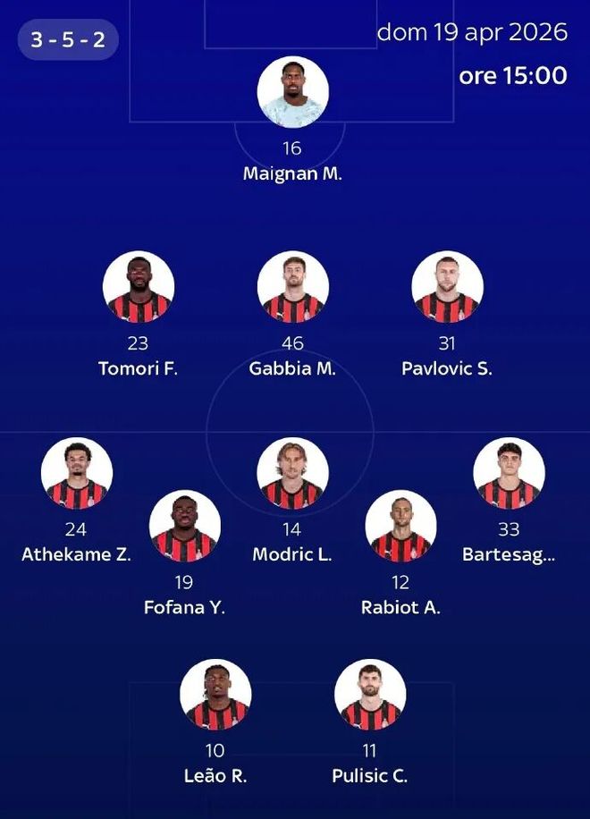 意大利天空体育预测米兰首发352:迈尼昂;托莫里、加比亚、帕夫洛维奇;阿特卡梅、福法纳、莫德里奇、拉比奥特、巴特萨吉、普利西奇、莱奥