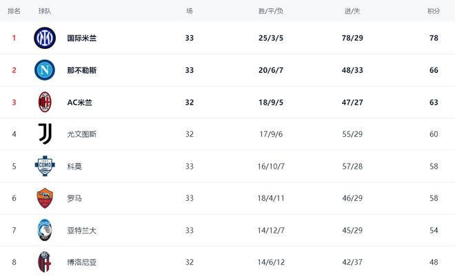 在积分榜上,国际米兰以78分高居榜首,战绩是25胜3平5负。那不勒斯输球之后,依然是66分,被国际米兰甩开12分。冠军归属基本失去了悬念。AC米兰以63分排名第3。第4的是尤文图斯,拿到60分。科莫58分,排名第5。罗马战平亚特兰大之后,也是58分,排名第6,与欧冠区有2分的差距。亚特兰大54分,排名第7。