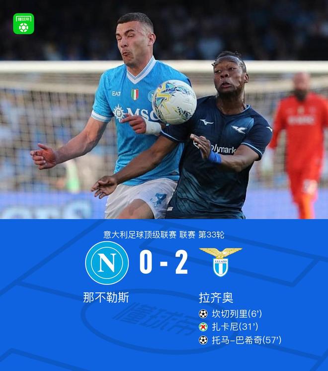 北京时间4月19日意大利足球顶级联赛第33轮,那不勒斯主场对阵拉齐奥。上半场坎切列里首开记录,扎卡尼失点,下半场托马-巴希奇破门扩大领先优势。最终比分那不勒斯 0-2 不敌拉齐奥。