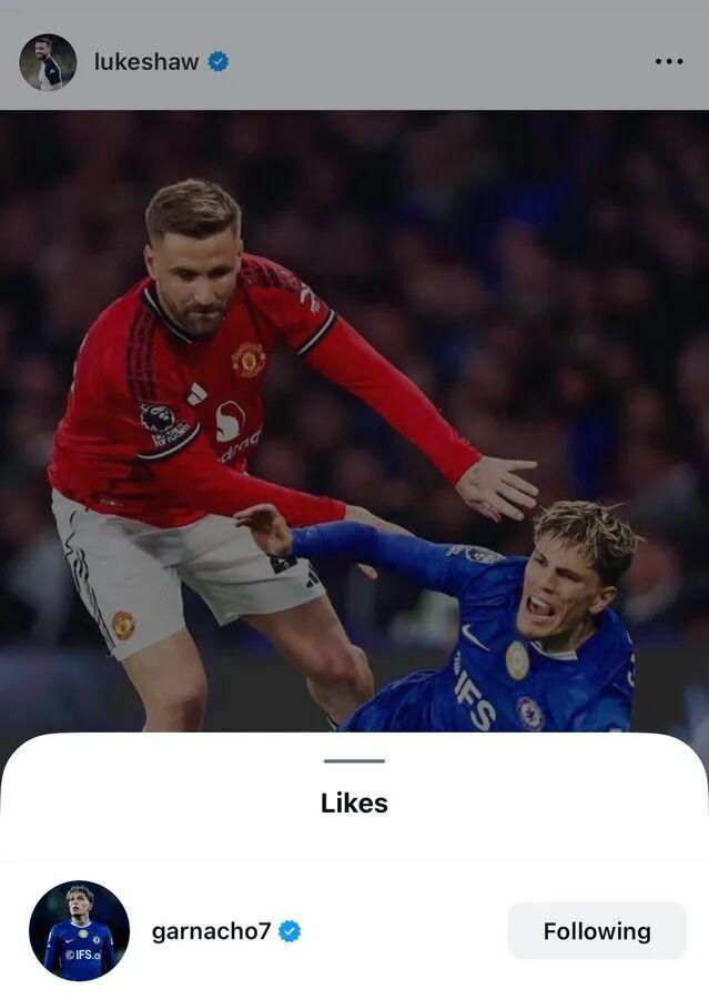 加纳乔点赞卢克·肖晒出的他们俩在比赛中对抗的照片
