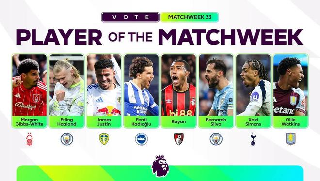 北京时间4月23日,英超官方公布了第33轮比赛最佳球员的候选名单,其中哈兰德、B席、吉布斯-怀特、哈维-西蒙斯、沃特金斯等球员在列。